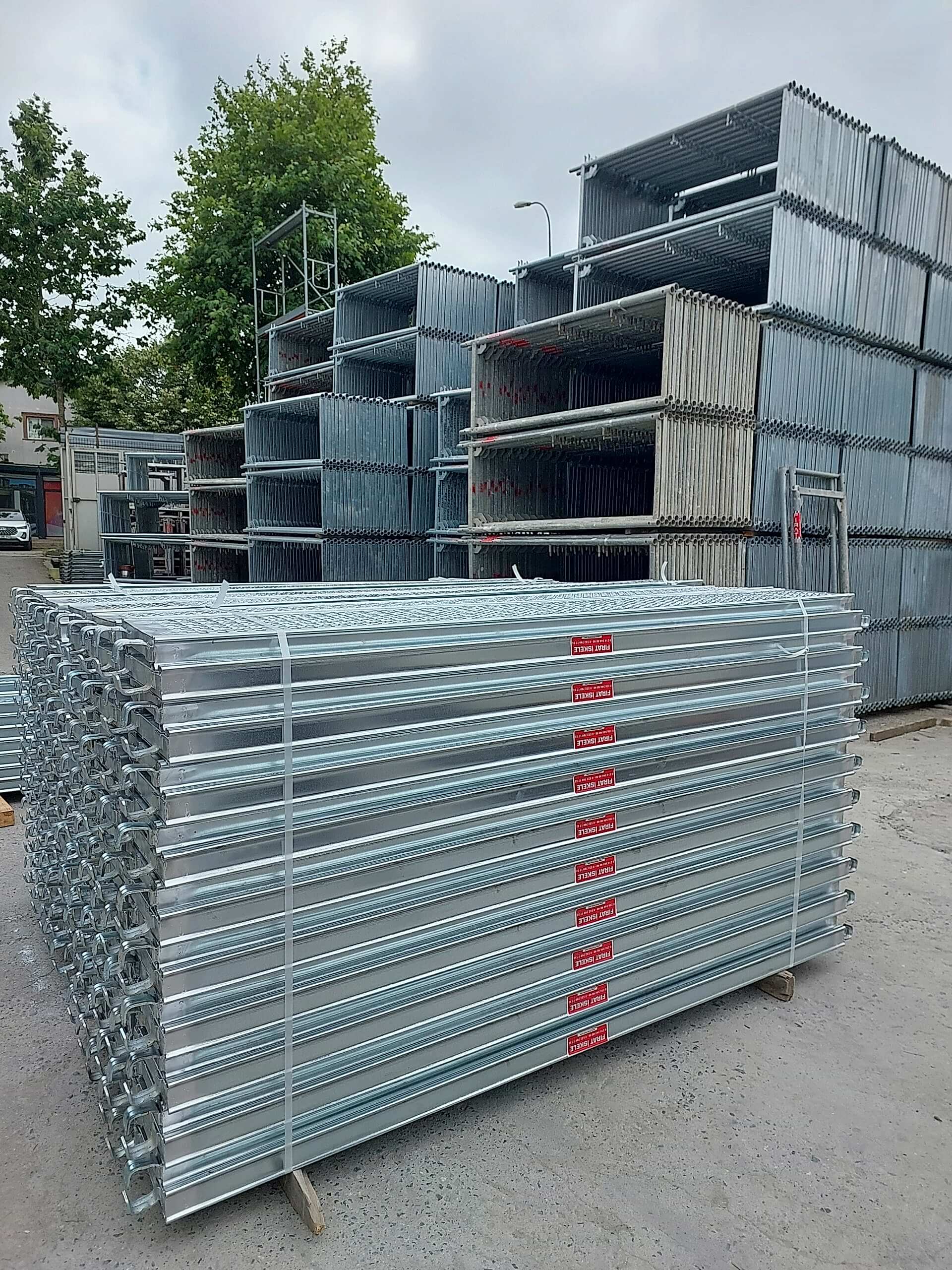 Güvenlikli İskele Sistemi, 48*3 mm TSE belgeli borulardan üretilen panolardan, bunları birbirine bağlayan 34*2,5 mm TSE belgeli borulardan üretilen yatay ve çapraz bağlantılardan, et kalınlığı artırılmış çelik kalas ve merdiven platformlardan, yan korkuluk, topukluk, başlangıç ayağı ve alt ayar millerinde oluşur.