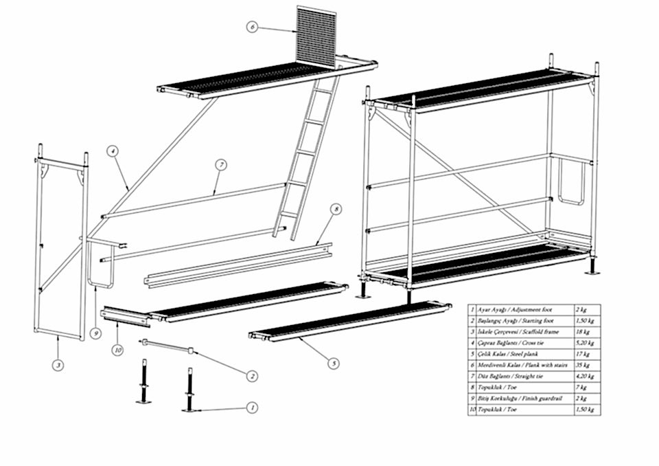 Güvenlikli İskele ana elemanları pano, başlangıç ayağı, ayar mili, yatay ve çapraz bağlantı, yürüme platformu, iskele içi merdiven, korkuluk ve duvar bağlantı elemanıdır. Sistemin genel prensibi her katta 50 ve 100 cm’de yatay bağlantı olması, her katta çift sıra yürüme platformu olması ve katlar arasında geçişin merdivenli platformlarla sağlanmasıdır.